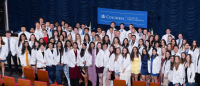 Ninety-six members of the Columbia University College of Dental Medicine Class of 2026 made the transition from classroom studies to clinical practice at a recognition ceremony held on Wednesday, June 25, 2025. Family and friends of the students attended to watch as students made the ceremonial leap.